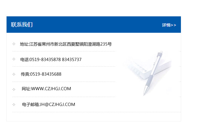 地址:常州市新北區友邦商務大廈1幢16、17層  電話:0519-85101652  傳真:0519-85112595  郵編:213022  網址:www_cz-jiayue_cn.bjjhzyy.com  郵箱:xiajifengaa@163.com